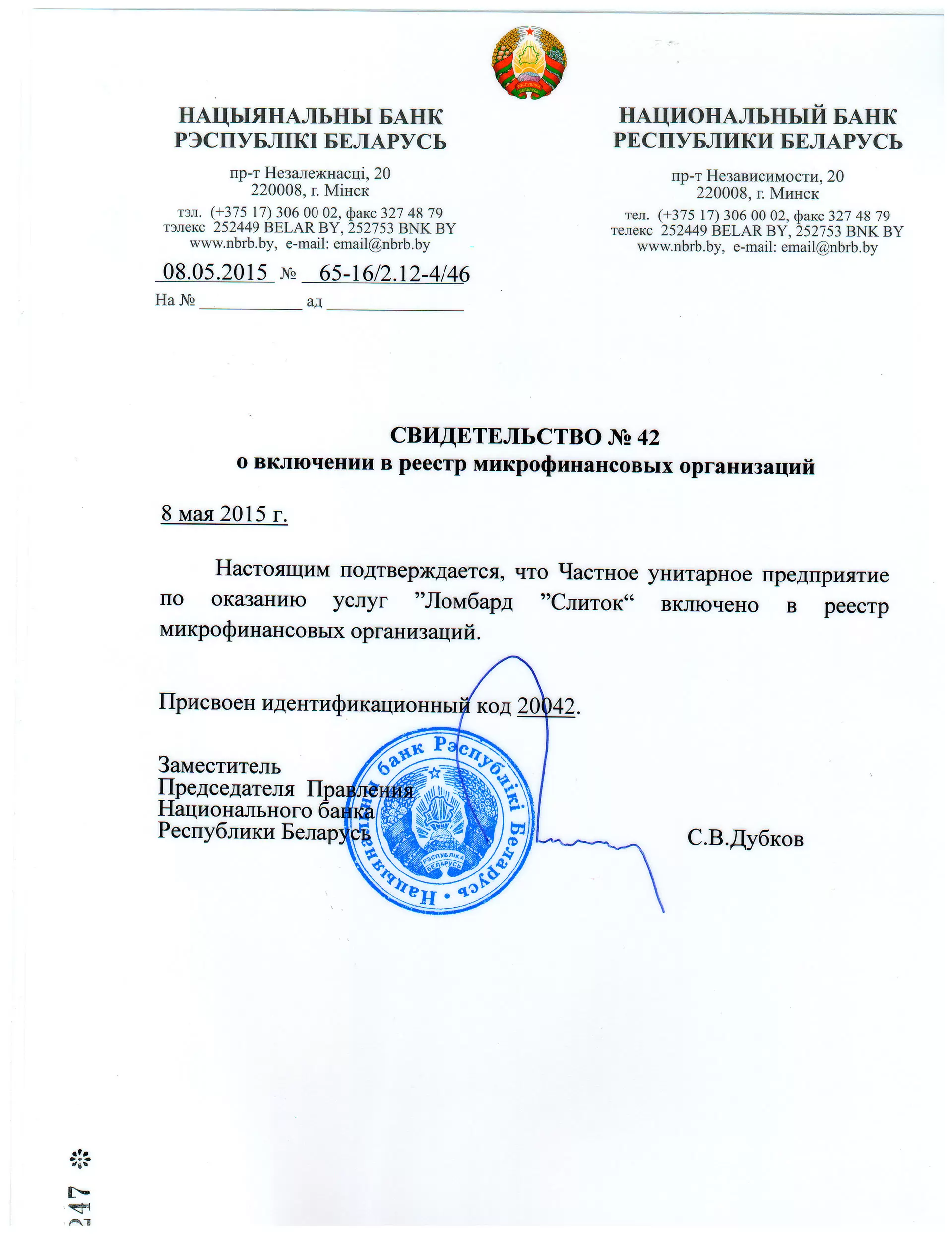 Свидетельство о включении в реестр МФО: № 42 от 08.05.2015