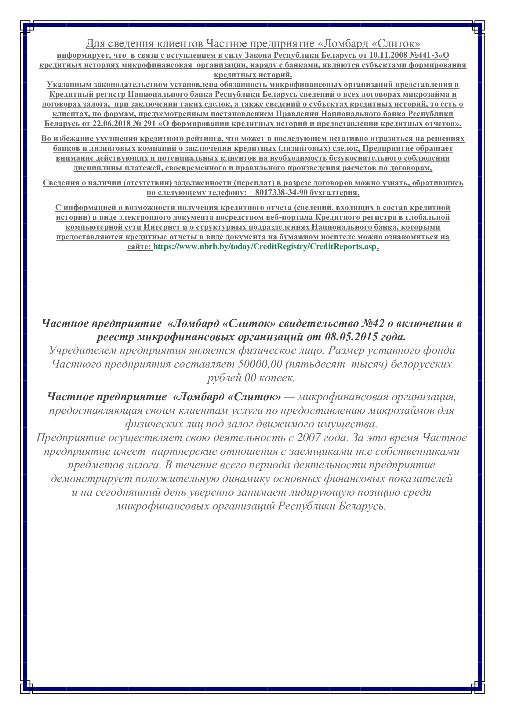 Для сведения клиентов Частного предприятия "Ломбард "Слиток"